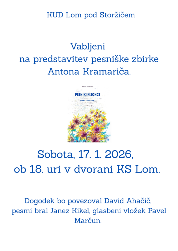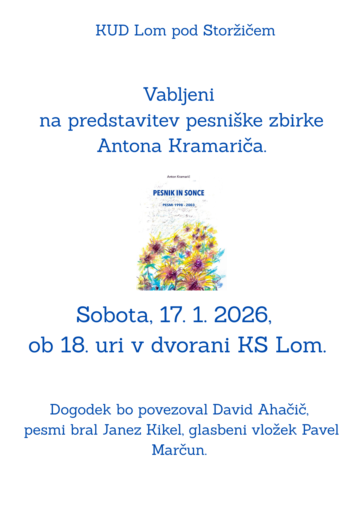 KUD Lom pod Storžičem vabi v soboto, 17. 1. 2026, ob 18. uri v dvorano KS Lom na predstavitev pesniške zbirke Antona Kramariča z naslovom Pesnik in sonce.