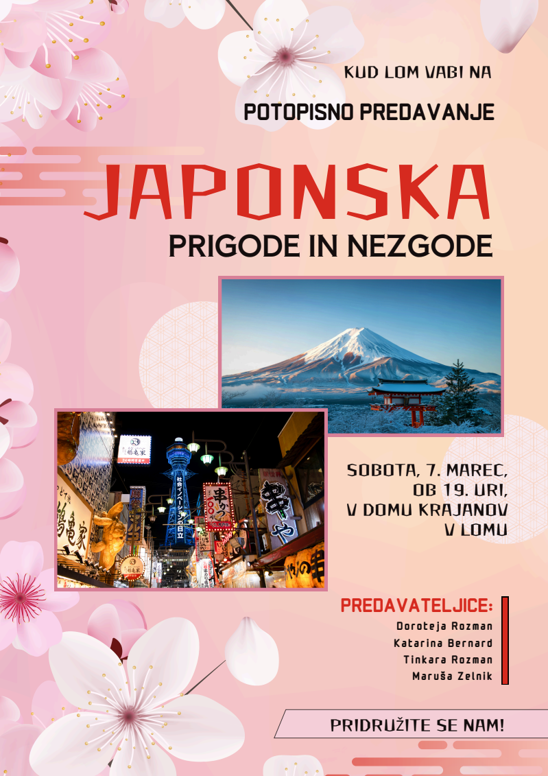 KUD Lom v soboto, 7. marca 2026, ob 19. uri vabi na potopisno predavanje po Japonski.